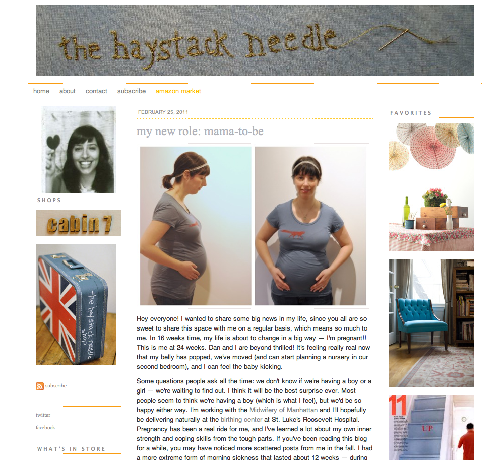 one of my newer products are these screen-printed organic tunic tees (extra long tee shirts from alternative apparel). i just love the longer length (great to layer too), and jen from the haystack needle brought to my attention how CUTE and practical these are for moms-to-be! Here she is modeling, taken from her wonderful blog.